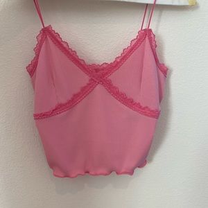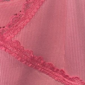 Color: Pink lace outlines slightly ribbed spaghetti strap never worn(didn’t fit)