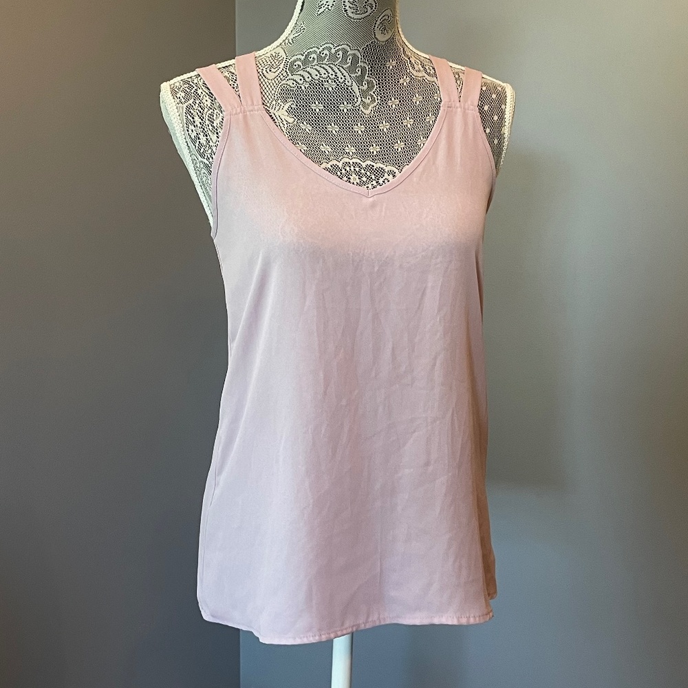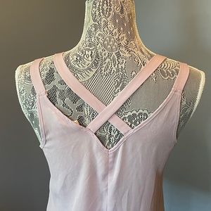 Lightweight rosy pink shell with criss cross back and double strap detail. Slight V neck, almost sweetheart neckline.