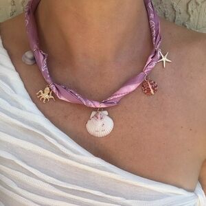 Elegant pink shell charm necklace perfect for adding a touch of the ocean to your style. Features delicate shell and starfish charms.