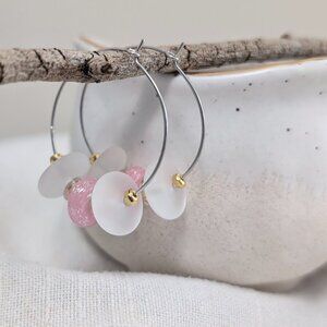 These handmade hoop earrings are for pierced ears. The stainless steel hoops are selected for their ( more so ) hypoallergenic and sturdy qualities. This pair is a fun mix of pinks and gold, clear and white. Feminine and fun!