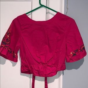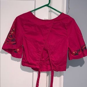 Cute pink top with floral poofy sleeves. The back is crossed and a little open! Perfect for summer! Is a medium but fits like a small.