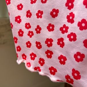 A bright and cheerful floral top with lettuce trim waist and sleeves.