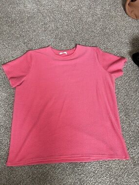 Soft pink short sleeve ribbed tee with a classic crew neckline. Lightweight, breathable fabric for everyday comfort. Versatile style that pairs easily with jeans or skirts. Easy-care material for low-maintenance wear.