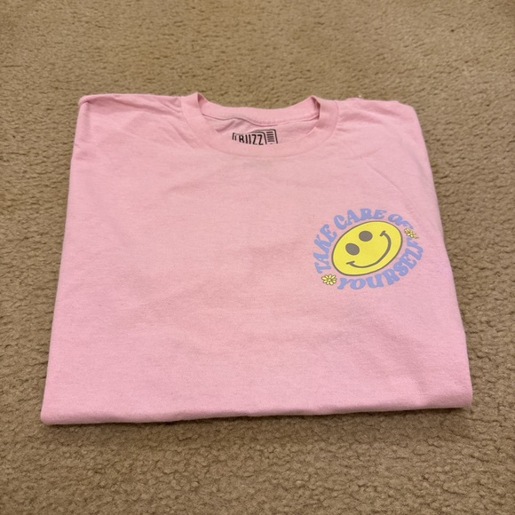 This soft pink tee features a cheerful smiley face graphic on the upper left chest, adding a playful touch to your casual wardrobe. Made from comfortable cotton, it's perfect for everyday wear.