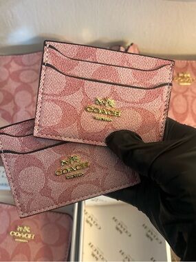 Elegant set in pink bag set. Includes a handbag, cardholder, and key pouch. Signature pattern design.