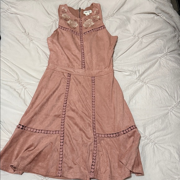 Elegant pink sleeveless dress featuring beautiful embroidered details. Perfect for any occasion. Velvet