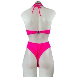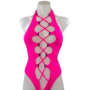 Pink Sleeveless Halter Cross Hollow Out Thong One Piece Swimsuit Swimwear Size S