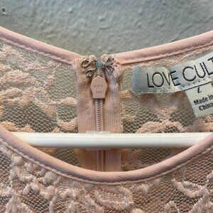 keywords: lace skater dress, light pink dress, sleeveless formal dress, Love Culture dress, lace overlay dress, sheer back dress, zipper closure dress, elegant summer dress, pastel skater dress, women's party dress, size large skater dress, pink lace formal wear, flowy lace dress