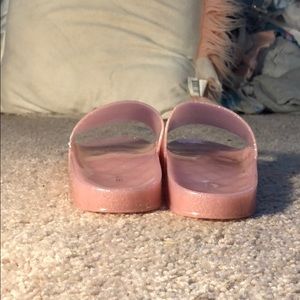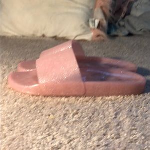 Pink and sparkly, hard plastic (kind of reminded me of jelly slides but hard)
