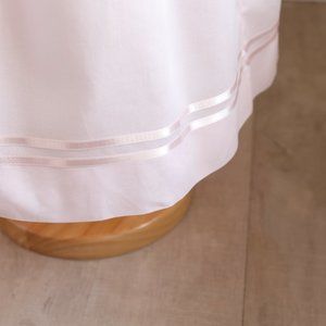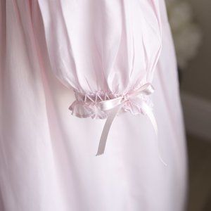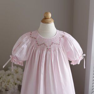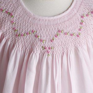 This Little Girl's Boutique Smocked Bishop Dress is Perfect for Spring! The 100% Peruvian cotton dress is done in a pastel pink (Peruvian cotton is Eco-friendly hand-harvested. The benefits are an extremely soft, high quality cotton, that is pile resistant and more resistant to wrinkles. It's great for those with sensitive skin.) Besides being comfy, the dress is LOVELY! The rounded neckline is trimmed in a matching piping and has a wonderful smocked design. Hand-embroidered two-toned pink bullion roses make a floral garland that wraps around the entire smocked neckline and shoulders. Embroidered green leaves make the roses pop! The short puff sleeves gather with a matching smocking and have a pink satin ribbon woven throughout that ties into sweet bows. Two bands of matching satin ribbon adorn the bottom of the skirt, above the hem. The back has an upper button closure. The perfect little High-End Boutique dress for Spring portraits, School portraits, parties, weddings, church or vacation. Worn for 15 minutes for a Spring Portrait- PERFECT CONDITION- STILL LOOKS BRAND NEW