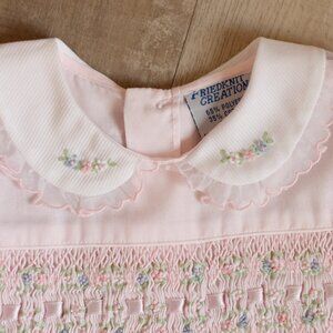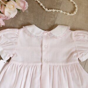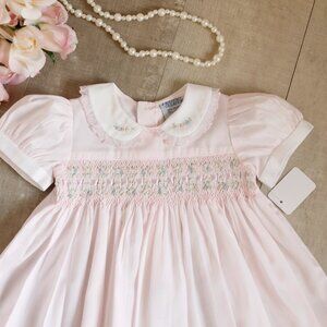 This Pink Smocked baby dress in size 3 Months is divine! The dress is a Friedknit Creations (by Feltman Brothers). The intricate design on this sweet little dress is like non I've seen before. The bodice is smocked with two layers of lattice style smocking with a row of accordion style smocking in between the layers. Within the accordion smocking, a pink satin ribbon is woven throughout. On each side of the ribbon is intricate pink, white and blue floral embroidery with green leaves. The entire smocked area is bordered with pink piping. The Peter Pan collar is done in white and has an organza ruffle with an embroidered pink scalloped edge. The collar also has matching pink white and blue floral vines. The short puff sleeves have a white band, matching the collar. The PERFECT Spring Dress for your little baby girl! Great for Portraits, Chuirch, weddings or other special occasions. Stunning, rare Design!! NWT