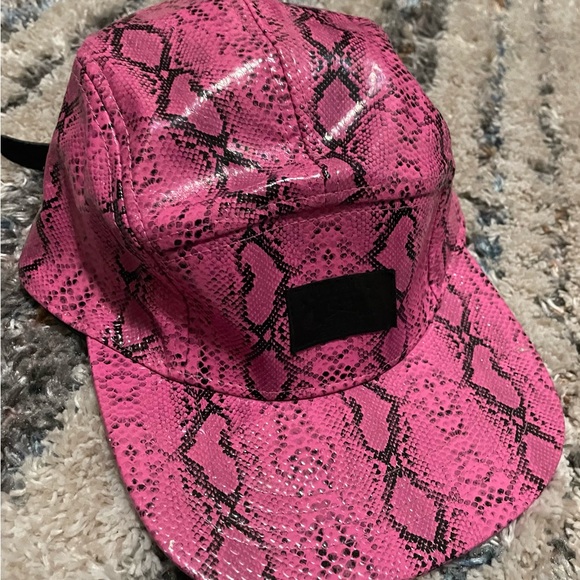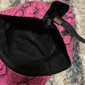 Vibrant pink cap with a striking snake print design. Features a black patch detail.