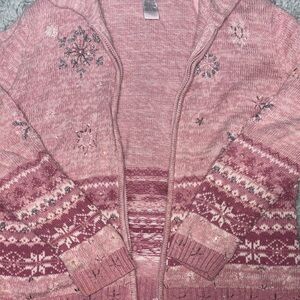 Charming pink cardigan zip-up with snowflake patterns. Soft and warm. Ideal for layering.