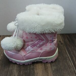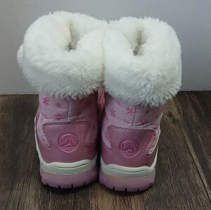 Keep your child's feet warm and stylish with these adorable pink snowflake boots. Perfect for winter adventures.