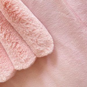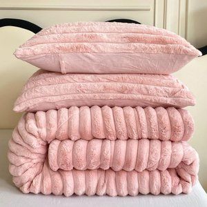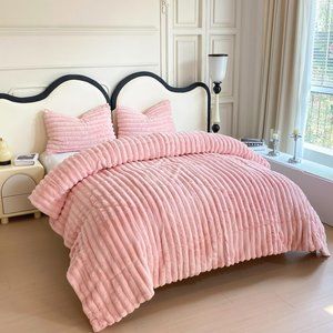 Pink Soft Faux Fur Bedding Set Striped Comforter Pillow Shams Queen Size Bed