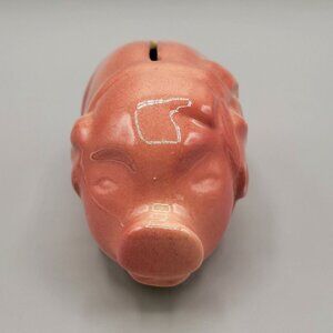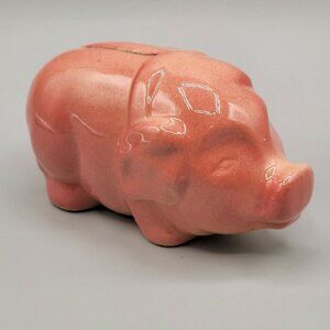 Pink round sow with a bow around her neck. This piggy bank is ceramic and has no stopper, it's the kind that you have to break if you want your money back out. Unbranded.