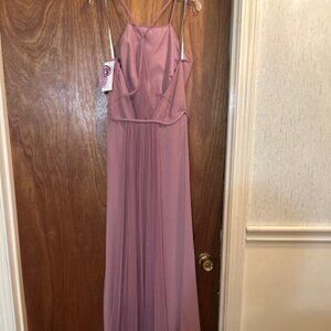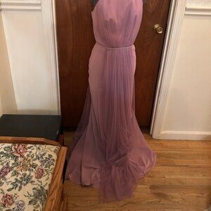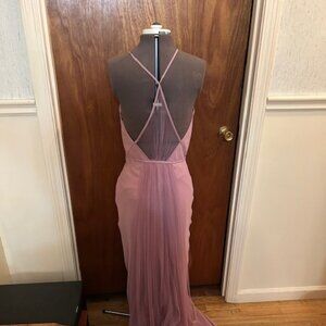 Turn heads with this stunning mauve maxi dress featuring slim spaghetti straps, a soft V-neckline, and delicate pleating along the bodice. The cinched waistline flatters the figure, while the floor-length, airy skirt creates an effortlessly graceful silhouette. Lightweight and feminine, this dress is perfect for weddings, garden parties, or summer nights out. Size: M Condition: NEW