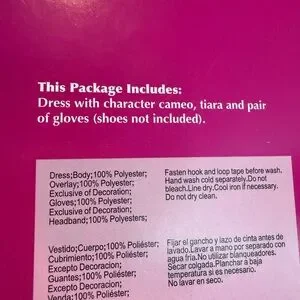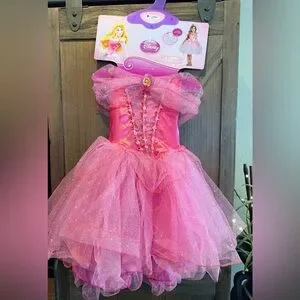 Shimmery pink tulle skirt with layered sparkle. Satin-look bodice with decorative ruffle trim and brooch accent. Off-shoulder glitter tulle neckline. Perfect for dress-up and Halloween play.