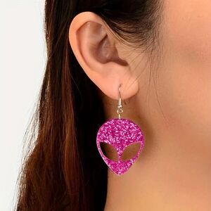 Make a bold statement with these pink sparkly alien acrylic earrings! Featuring a vibrant glitter finish, they add a fun and whimsical touch to any outfit. The lightweight acrylic design ensures comfortable wear, while the gold alloy earring post adds a touch of elegance. Perfect as statement earrings or costume jewelry for Halloween, these earrings are out-of-this-world fabulous!
