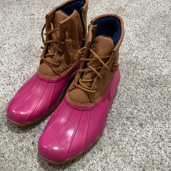 Pink and light brown leather boot , only worn once , really comfortable and girls 5 but woman 7