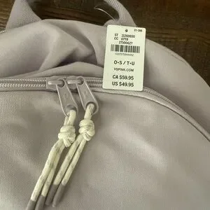 Chic light lavender backpack with PINK logo. Includes dual zipper pulls and sturdy straps. Has many compartments and pockets. Has two side pockets for water bottles.