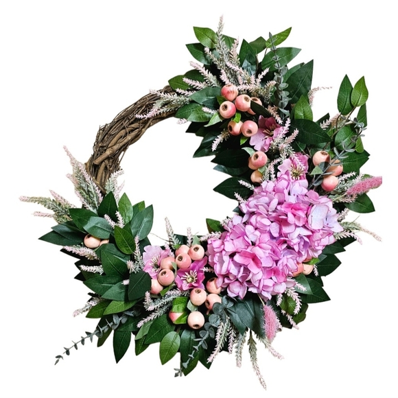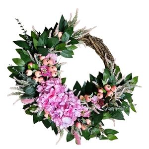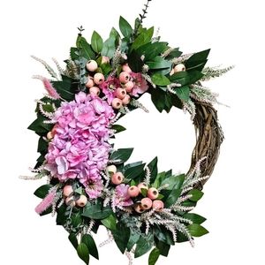 Add a charming touch to your home decor with this lovely Pink Floral Spring Wreath. Handcrafted from mixed materials, this 18in artificial wreath is perfect for decorating your door during the spring season. The wreath is made by taralynnboutik and features beautiful hydrangea flowers in pastel pink that will complement your home's color scheme.