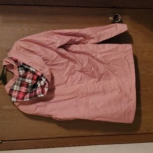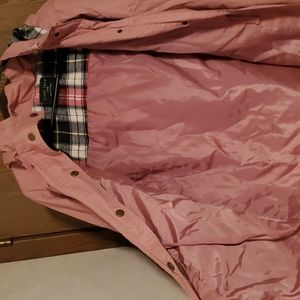 this is a pink jacket with a satin-like inside. It zips and buttons up. It has 2 big pockets in the front and has a hood