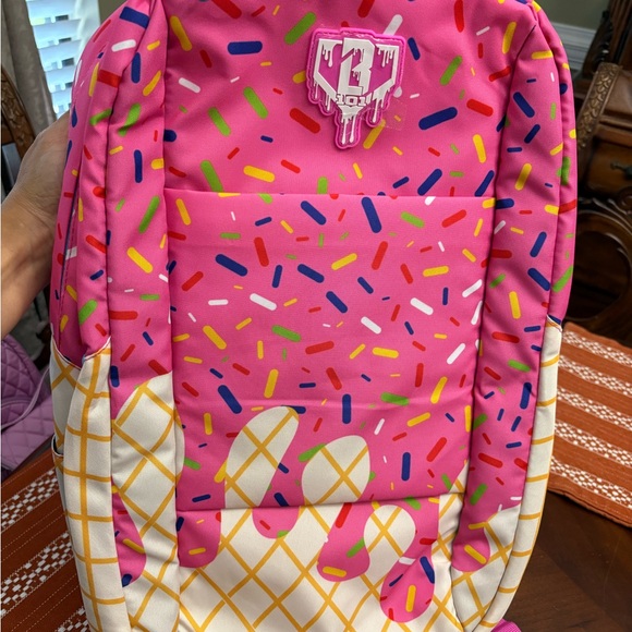 Vibrant pink backpack with colorful sprinkles and a unique design. Perfect for adding a fun touch to your style.