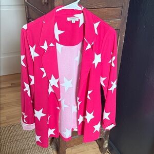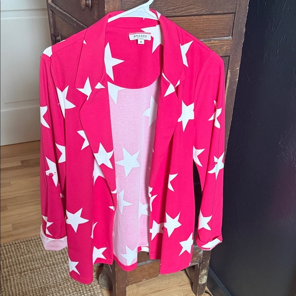 Vibrant pink blazer with bold white star pattern. Perfect for a standout look.