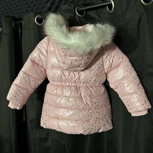 Charming pink puffer jacket with a star pattern. Features a cozy hood with Sherpa and faux fur trim. New condition w/o tags.