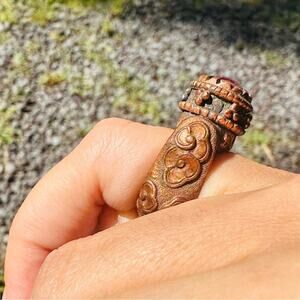 Featuring a pink starburst ruby at its center, this chunky Pitango ring radiates raw elegance. Set in handcrafted copper, the design is bold yet mystical—perfect for collectors, fashion rebels, or magical adornment lovers. One-of-a-kind piece.