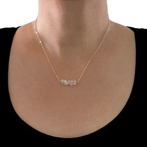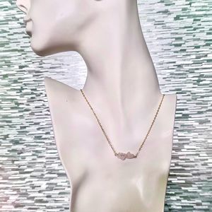 This pink stone cluster necklace with gold plated cable chain looks great with any outfit on its own and even better layered with other necklaces for many more fashionable possibilities. This stunning necklace features a cluster of delicate pink stones intricately arranged and suspended from a gold-plated cable chain, making it the perfect accessory for layering with your favorite necklaces. The soft and feminine hues of the stones add a touch of sophistication and grace to any outfit.