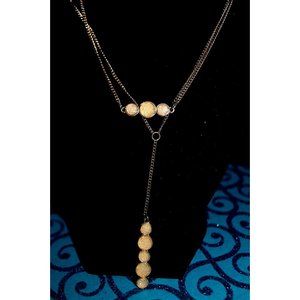 This lovely Double Strand gold tone chain necklace has a set of 5 pink genuine crystal stone settings and a set of 3 pink crystal stone settings, "Peas in a Pod" design and measure 1/4" each stone . Total length is 18" (Hooked, including extension) . It is adjustable, When worn it sits at a "matinee" length. No hallmark or maker stamped.