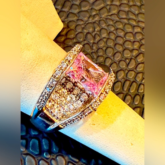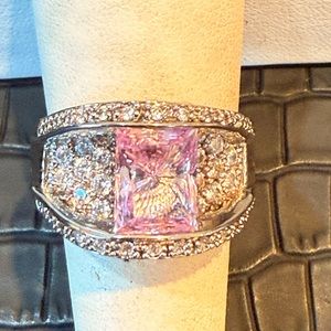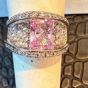Beautiful CZ pink emerald cut diamond floating over a bed of pav’e stones, set in precious sterling silver .925 stamped.