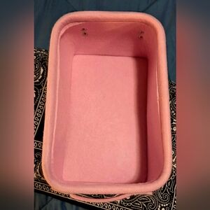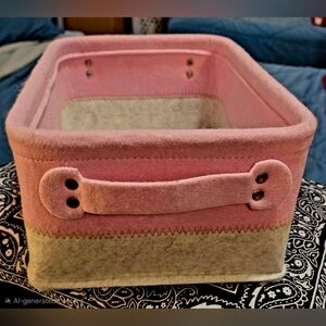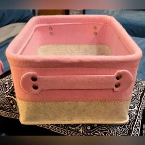 These 2 units are brand new and in excellent condition. One storage box is pink w/ a white stripe all the way around the bottom. The other box is a solid pink. They have the feminine look with the cozy fuzzy feeling to the touch. Excellent storage look for any women's or young girls room to keep organization.