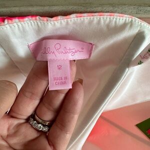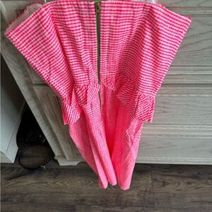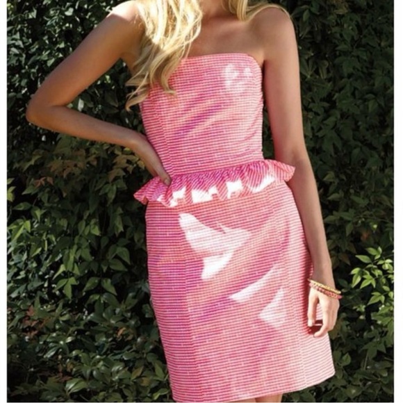 Lilly-Pulitzer-Dress-Lowe-Strapless-Peplum-Fiesta-Pink-Pretty-Gingham Chic and stylish, this pink strapless dress features a playful ruffle detail. Perfec