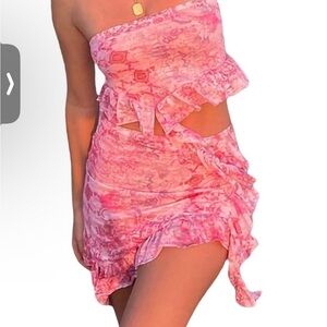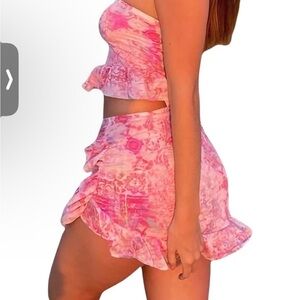Fun in the sun! Get ready to party in this chic pink strapless set with ruffle details. Perfect for summer! Size L both top and skirt Material has good stretch Never worn