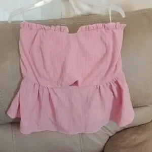 Stylish pink strapless top with ruffle accents. Ideal for casual wear.