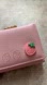 Cute compact pink wallet with strawberry design. Features gold clasp. Vegan leather.