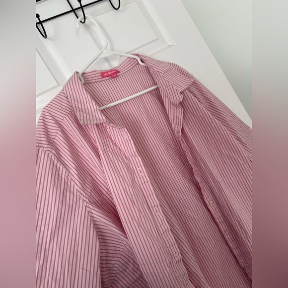 Pink striped button down that is labeled as a 3x and true to size. Would be cute with a black mini skirt and boots or as a bathing suit cover up :) Brand is Woman Within.