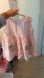 Adorable pink striped dress featuring heart-shaped pockets with floral trim. Perfect for a cute and playful look.