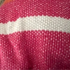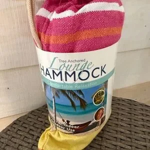 Comfortable pink striped hammock for relaxing at home or outdoors. Lightweight and portable design with durable rope attachments. Vibrant pink color adds a cheerful touch to your space. Easy to pack and carry for instant relaxation.