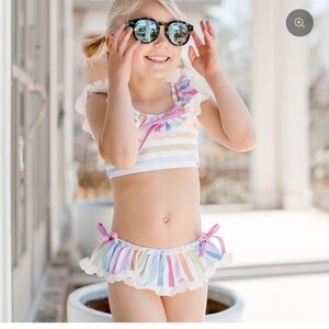 Adorable pink striped bikini set with ruffle details. Features a cute bow and lace trim.