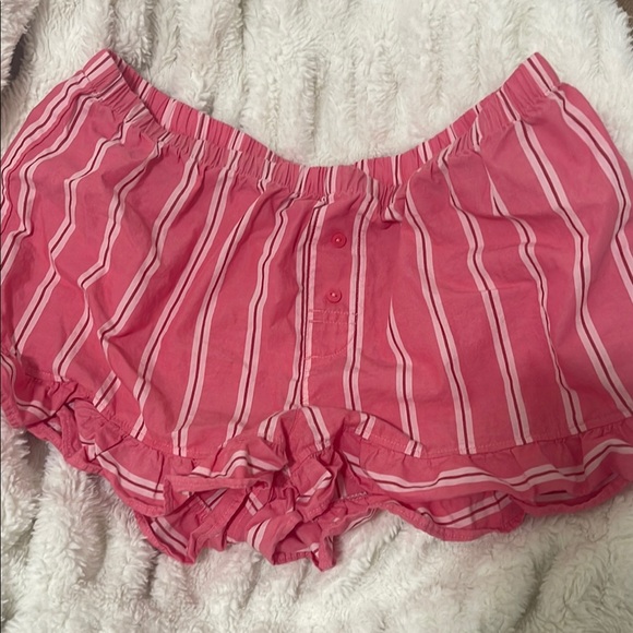 Chic pink shorts with white stripes and ruffle details. Perfect for lounging or casual outings.