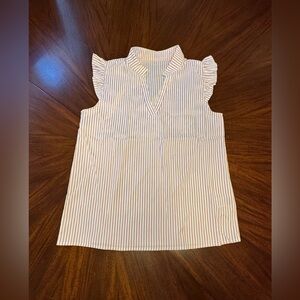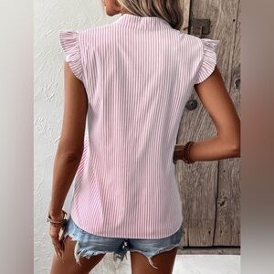 Elevate your style with this chic pink striped top. Featuring elegant ruffle sleeves, it's perfect for any occasion.