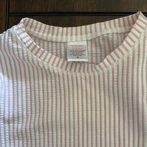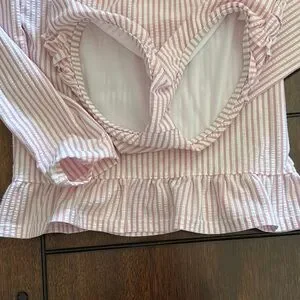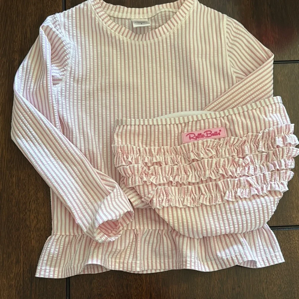 Adorable pink striped set with ruffle details. Includes a long-sleeve top and matching bottoms. Size 6- like new!