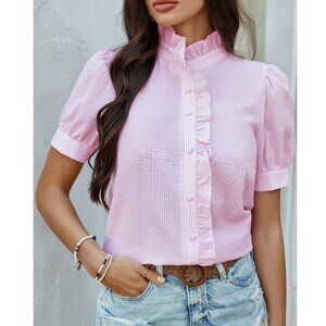 Pink Striped Shirt Button Down Puff Sleeve Blouse Ruffle Trim On Front & Collar
