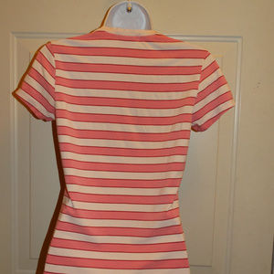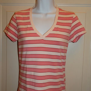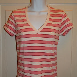 This is for a cute short sleeved tee shirt made by Banana Republic in a size Small, it is pink with dark pink stripes. It is made of 95% and 5% spandex. It is in good condition.
