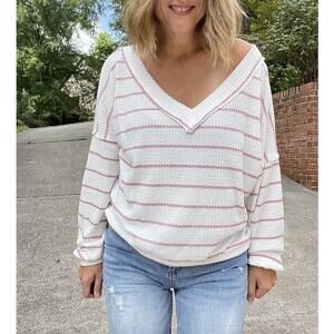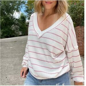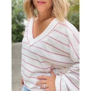 We're loving the sweet, cozy Maggie top! Featuring a soft knit with stripe print in pink and ivory, this is a standout piece that you'll reach for again and again!