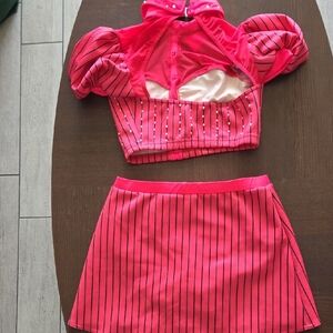 Stylish pink two-piece set with black stripes. Features a faux button-up top with puff sleeves and a matching skirt.